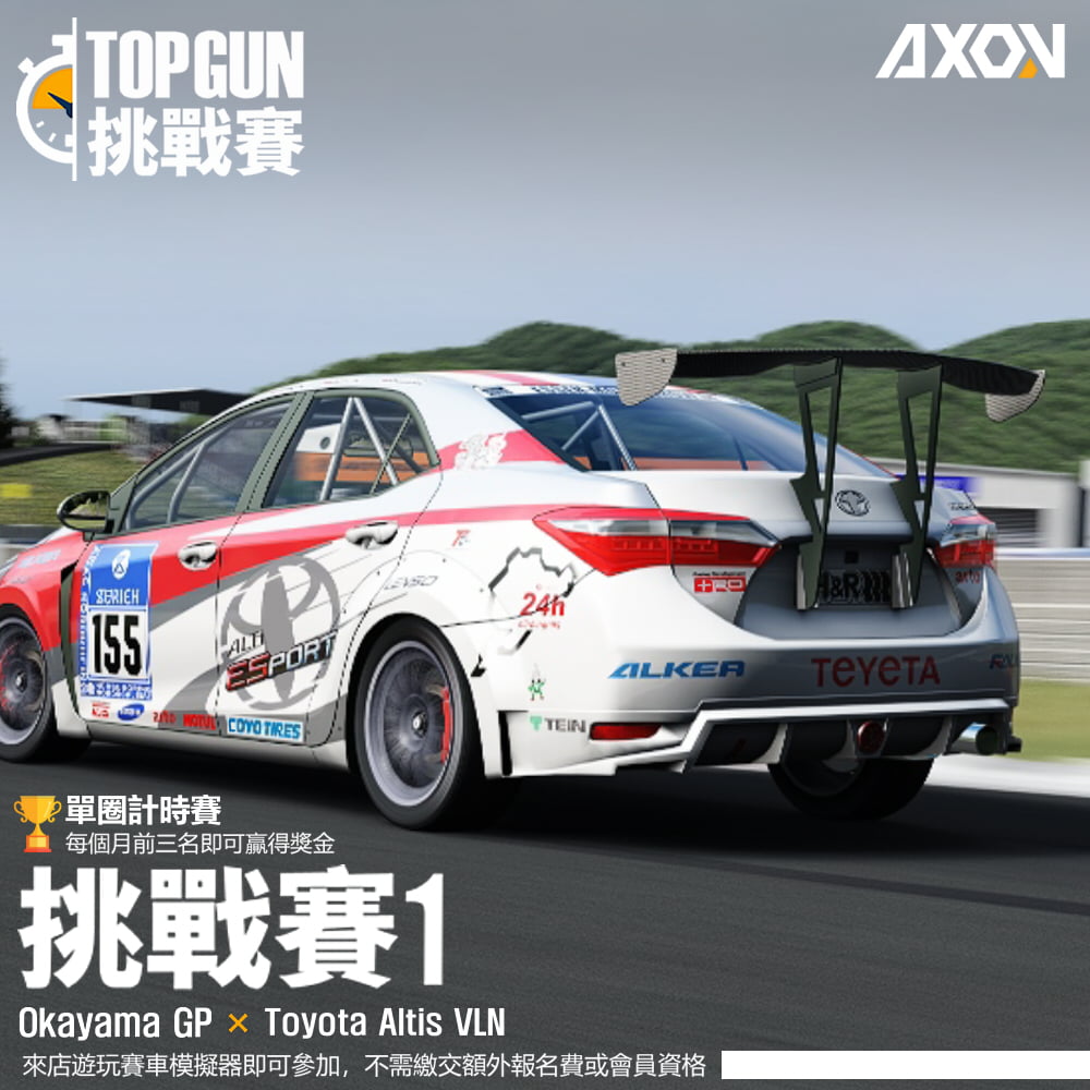 本月第一個挑戰再次回到著名的日本的岡山賽車場,中低速彎道的處理和對路線高低起伏的熟悉度會很重要。搭配的是Toyota的Altis VLN規格耐久賽車,為了賽車特化的底盤讓這台前輪驅動的小鋼砲可以緊湊的連續彎中穿梭自如,練習你對前驅車輛動態的掌握能力