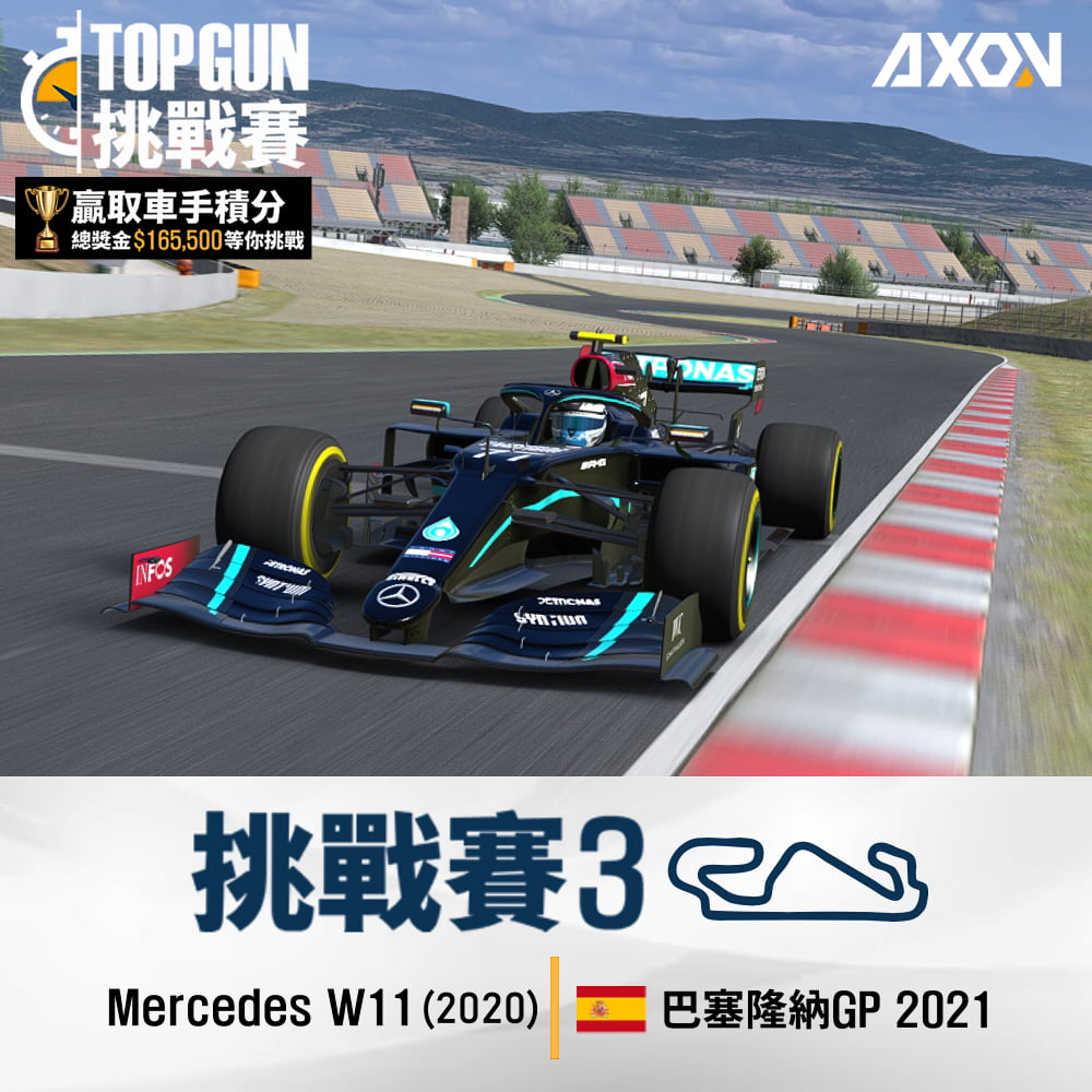 賽道使用2020年配置的巴塞隆納GP賽道。這條賽道以易守難攻、風向多變聞名,並有各種不同類型的彎道和高低起伏所構成,是過去幾年舉辦季前測試常用的賽道,用來熟悉或調教車子再適合不過!搭配的是2020年的方程式賽車,這年賽季更被認為是近年來車速最快的一年,適合挑戰極限的你!