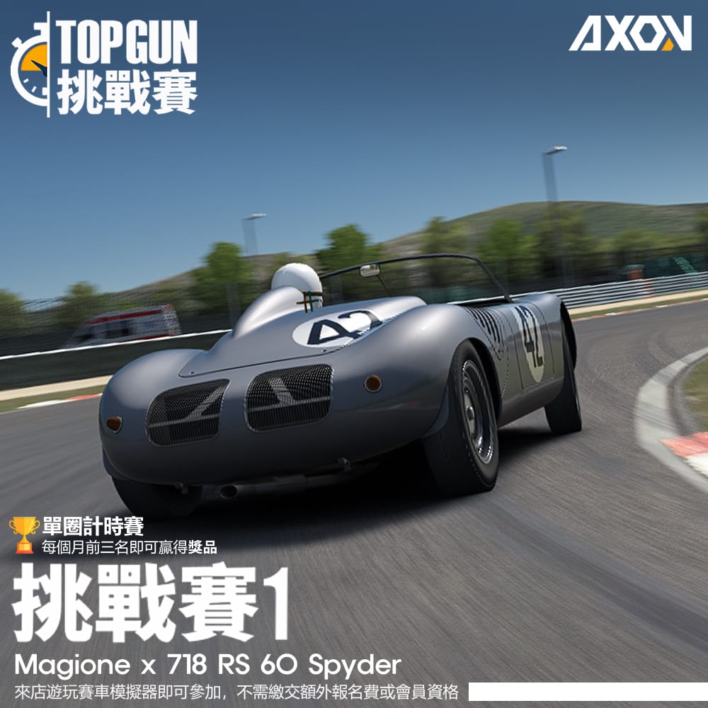 第一個挑戰賽在Magione,是義大利一個以技術性、短圈、節奏緊湊聞名的小型賽道,是車手、車隊與賽車學校最常用的場地之一。偏窄的賽道和開放式賽道其實很適合鍛鍊穩定操控,車手的眼睛要盯著彎心並且要知道自己要往哪裡開。搭配的車輛是傳奇的718 RS Spyder,在60年代馳騁Sebring、Targa Florio等知名耐久賽事,操控靈活且動力可掌控,非常適合鍛鍊基礎。