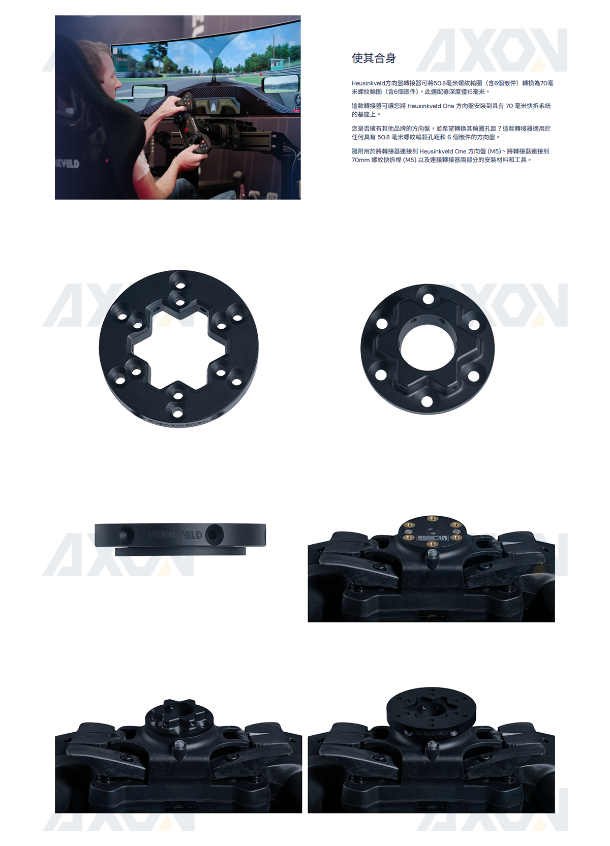 這款高品質方向盤轉接器可將 50.8 公釐方向盤輪圈轉換為 70 公釐規格。厚度僅 15 毫米,採用鋁合金材質。適用於 Heusinkveld One 及其他類似規格的方向盤。